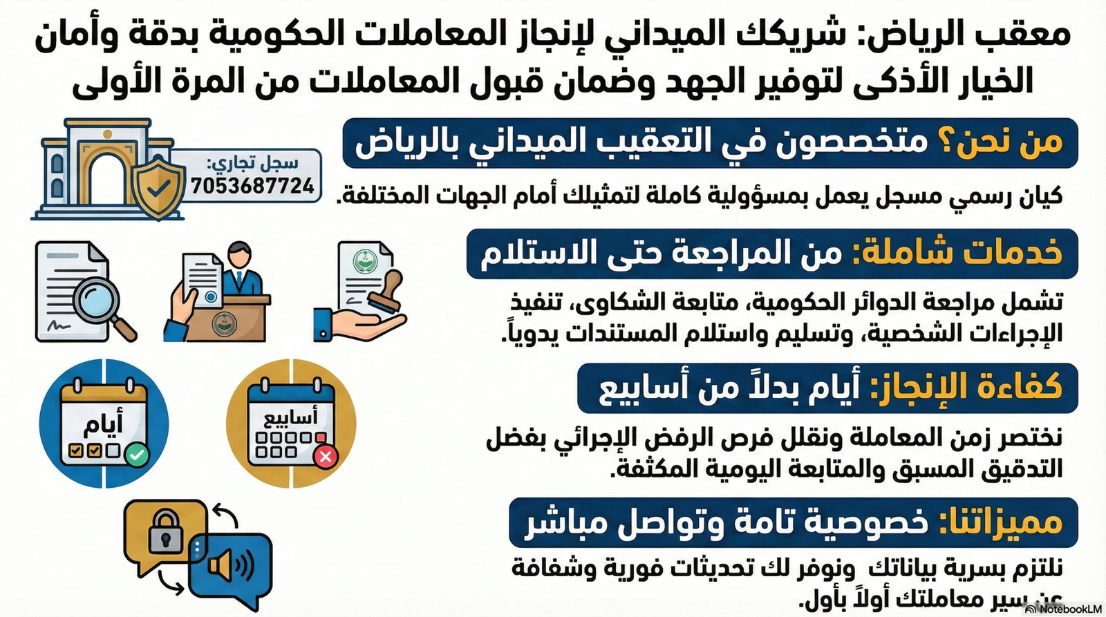 خبرة ميدانية: نمتلك خبرة عملية في مراجعة الجهات الحكومية والشركات داخل مدينة الرياض وفهم متطلبات كل جهة وإجراءاتها النظامية.